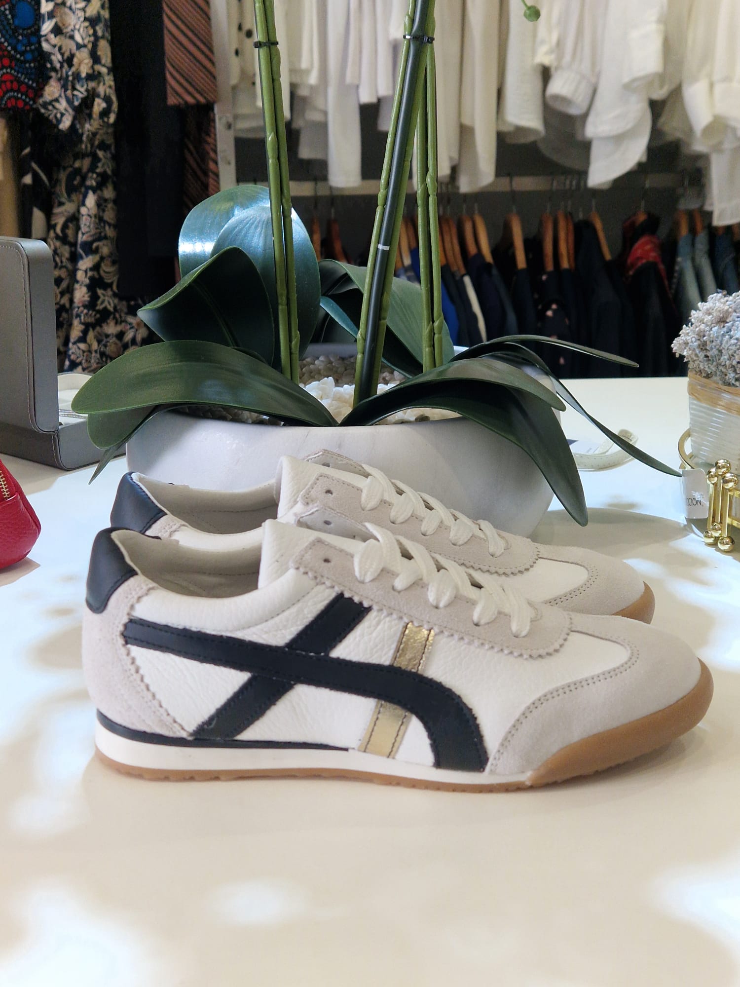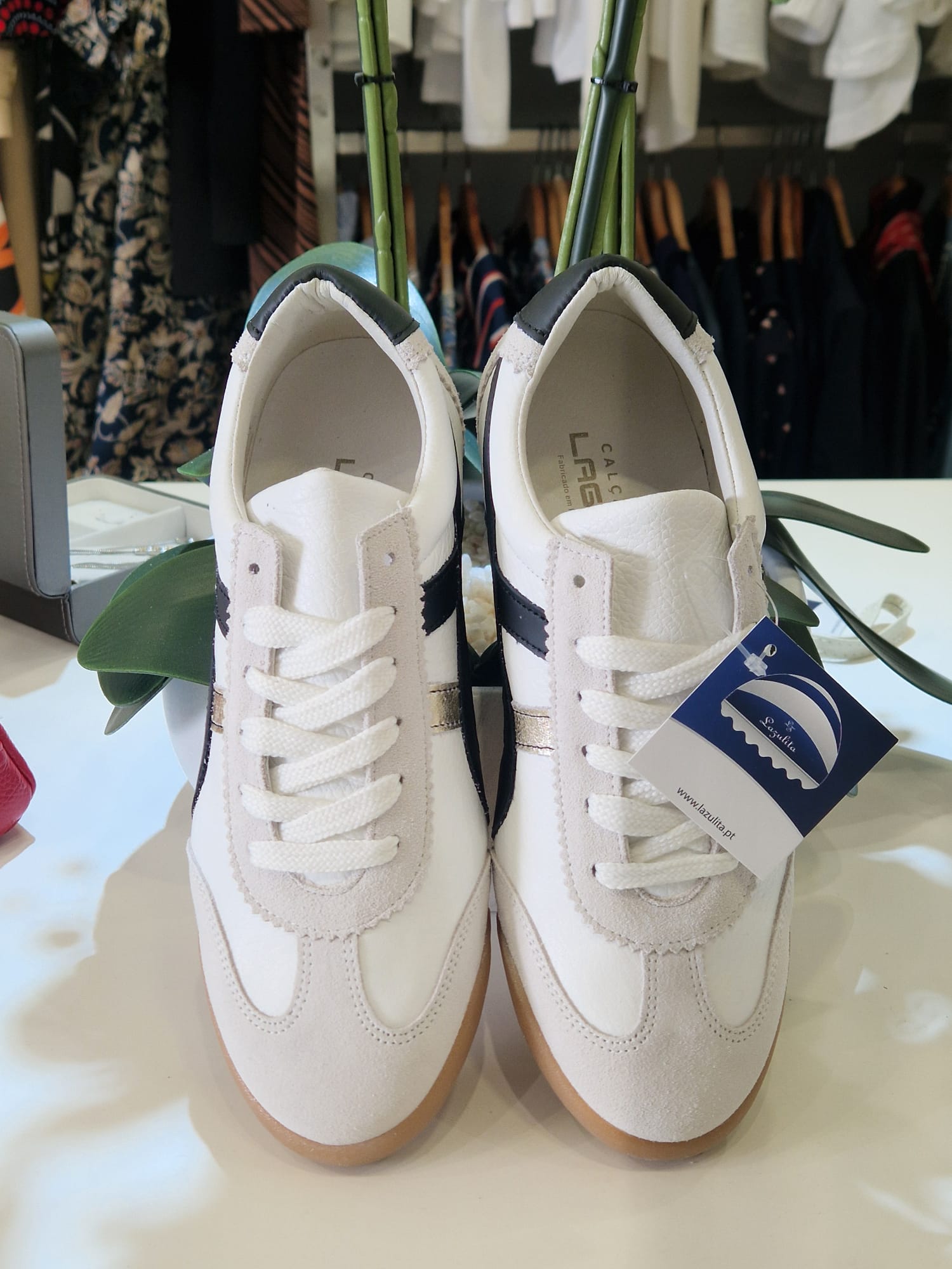 Sapatilha em pele branca preta com pormenor em dourado com atacadores.