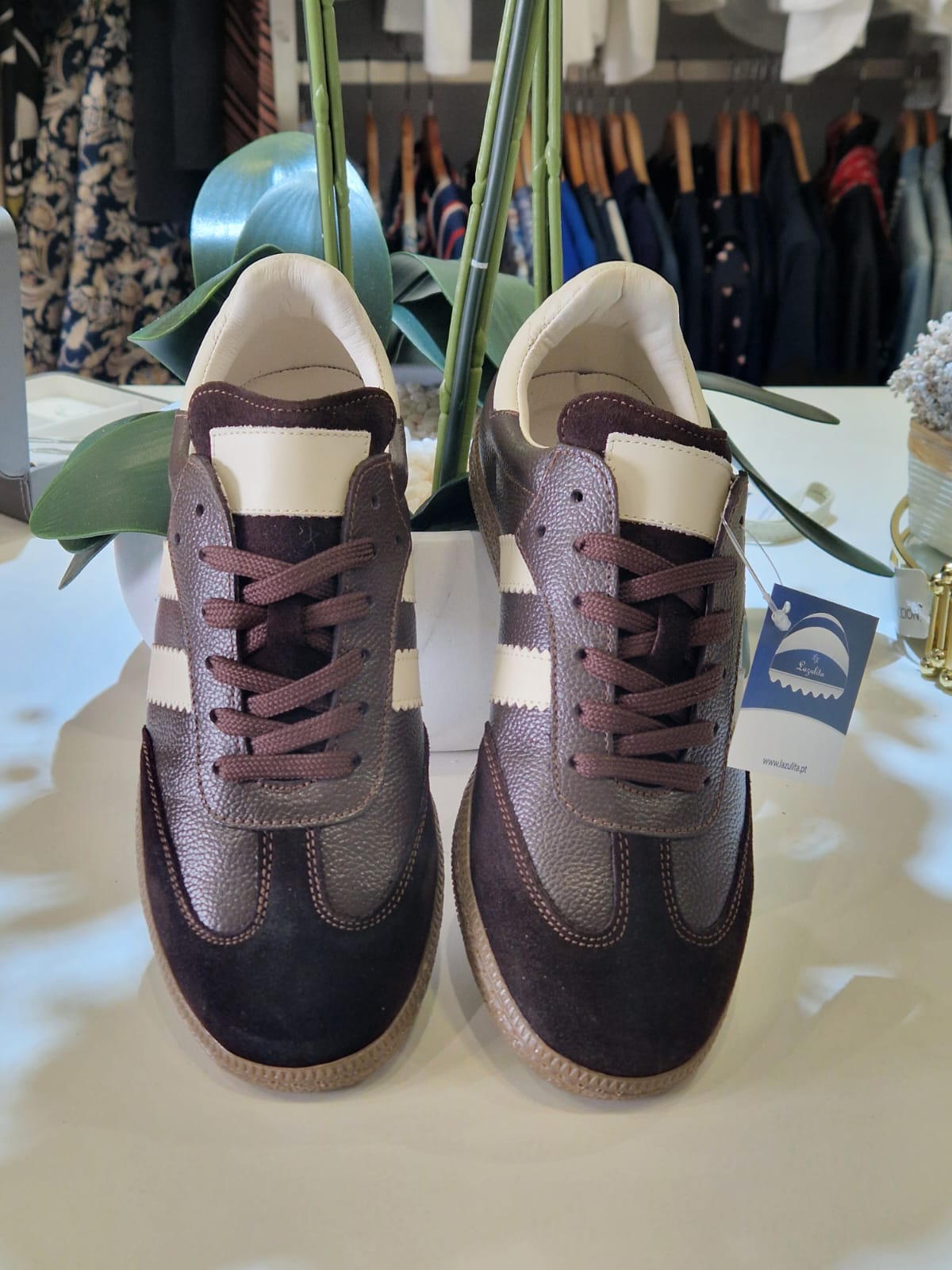Sapatilha em pele com atacadores.